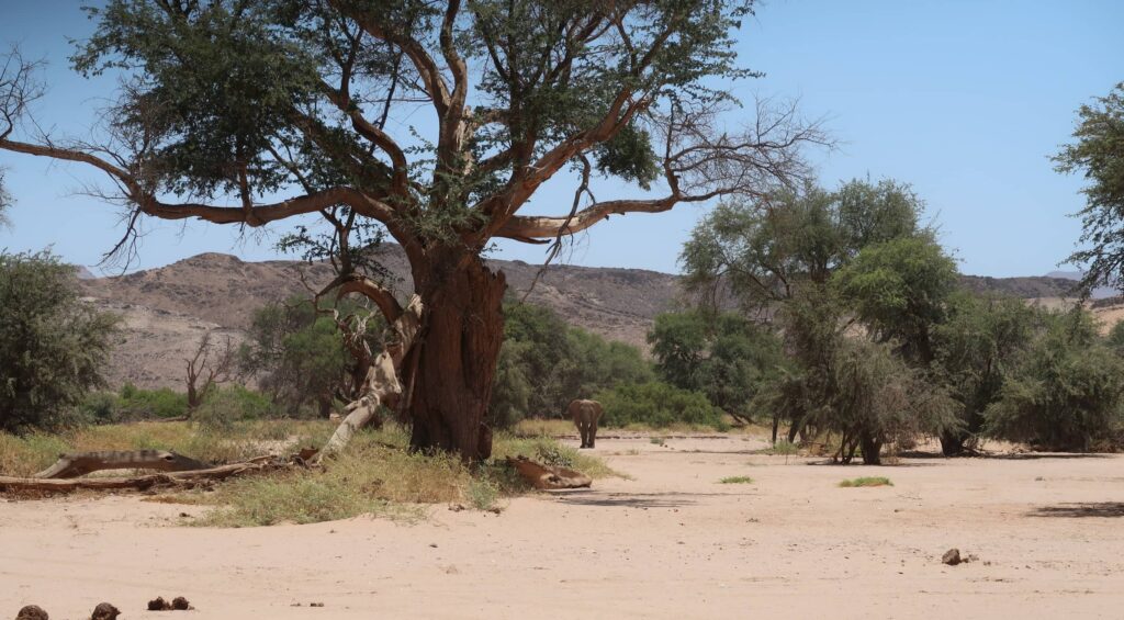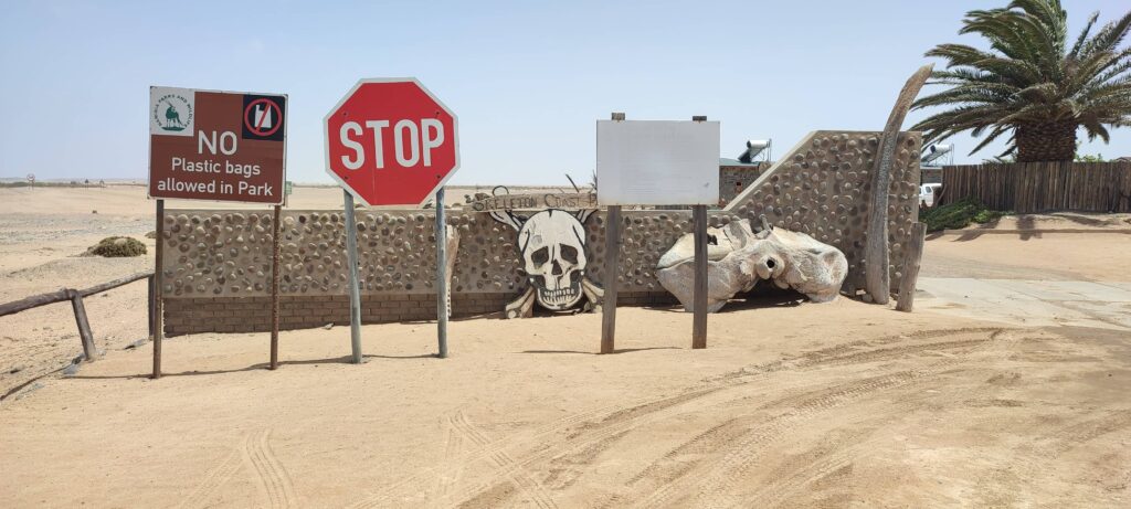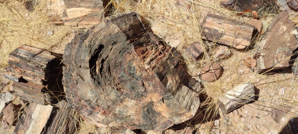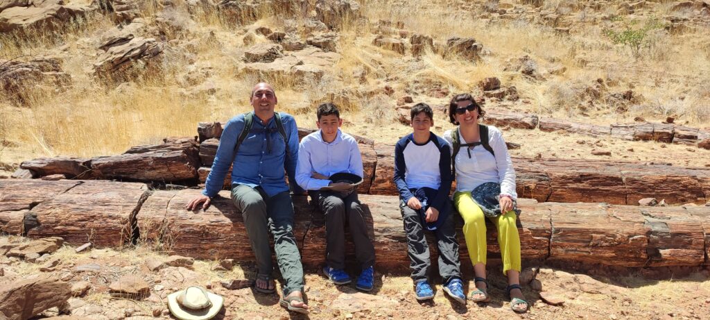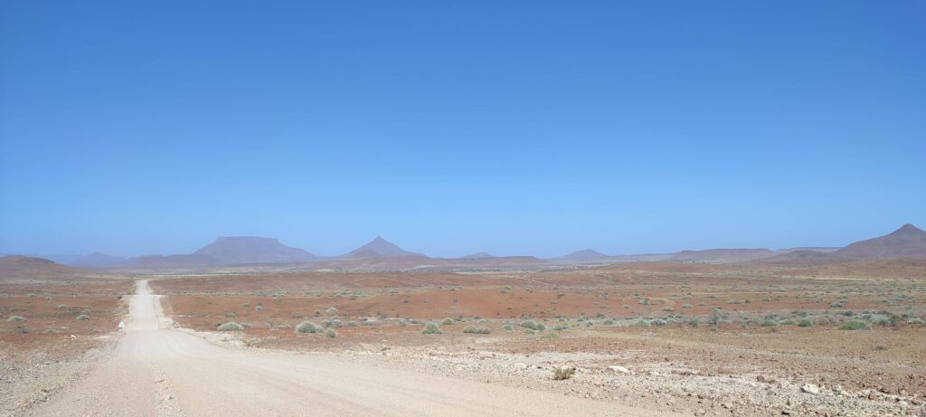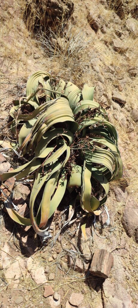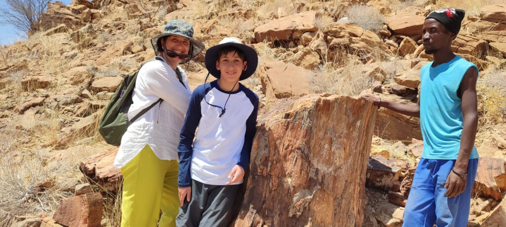 Nous étions particulièrement fatigués et la nuit fut salvatrice. Le lendemain : 2 objectifs : aller voir la Petrified Forest recommandée par notre hôte et visiter un village Himbas. Ben cette journée ne fut pas du tout ce qu’on avait prévu ! Le début : Petrified Forest s’est avérée très intéressante, un homme de la tribu Damara nous a rejoint sur le chemin et a commencé à faire le guide. Ce sont des arbres qui se sont transformés en pierres grâce à un processus alliant « centaine de million d’années / absence d’oxygène et tectonique des plaques ».