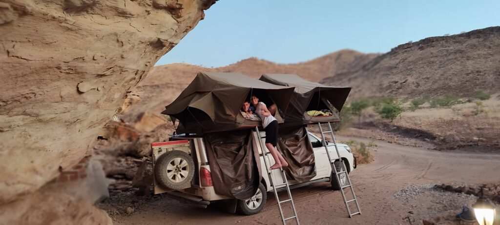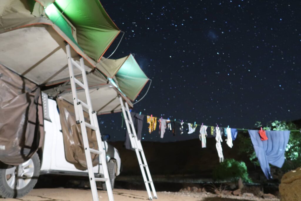 Après plusieurs heures de route, du français et des maths laborieux, la faim qui nous tiraillait nous arrivons à notre camps Haisra tented camp. Nous y passerons 2 nuits en pleine nature. Le décor est d’énormes rochers encrés dans un sable très volatile et sur lesquels squattent d’agiles babouins. La température à notre arrivée était douce mais en journée c’est une fournaise. Nous nous installons rapidement, mon chaton à la cuisine, les gosses qui râlent (faim), et moi je fais encore de la lessive.