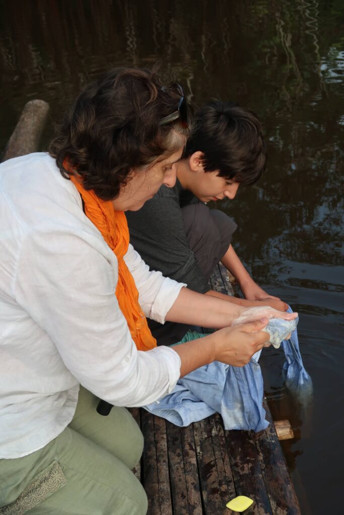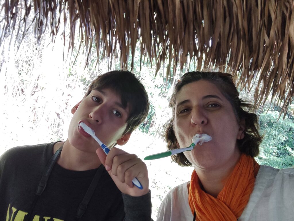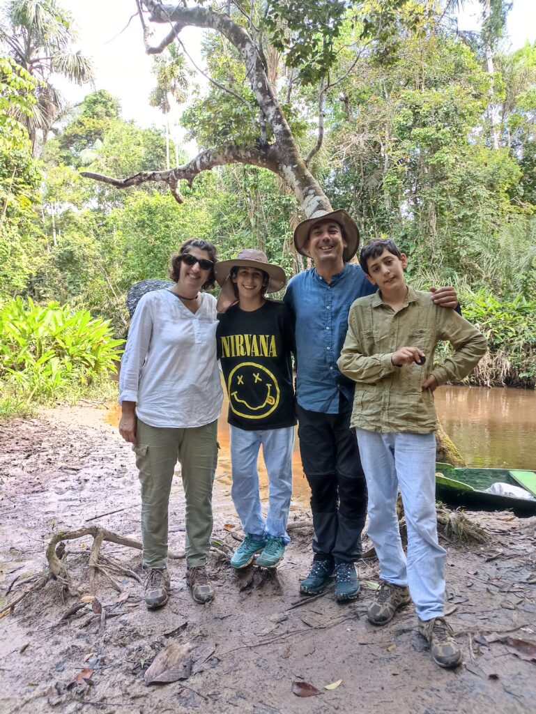 La Jungle est bien plus complexe que l’ idée qu’on s’en faisait au début. Tout d’abord c’est El Rio, une eau trouble, boueuse, poissonneuse. Nous voyagerons pendant 5 jours sur El Rio. Tous les 6 positionnées dans la barquette qui à chaque grand mouvement se remplit d’eau. Cette barque est précieuse car nous ne croisons pas grand monde sauf sur les camps. La jungle c’est aussi les bruits caractéristiques que l’on entend dans les documentaires, c’est les odeurs d’humidité, de plantes, c’est la chaleur accablante, c’est ce vert omniprésent et splendide. C’est spectaculaire vraiment!! La journée nous en avons à chaque fois plein les yeux, les oreilles. Nous apprenons énormément de choses avec nos guides c’est fabuleux. Reste que le soir c’est souvent plus compliqué dans les camps. La promiscuité conjugué au manque d’hygiène a rendu le voyage très inconfortable. Au camps #1 : nous dormions dans des espèces de box avec des matelas relativement sales mais secs. Des cafards profitaient de la nuit pour faire la java dans la cuisine. Dans le camps #2: pas de box, des matelas encore plus fins que des tapis de gym, des odeurs d’humidité si fortes qu’elles font penser à de l’urine de chat. Nos dormions les uns à coté des autres sans absolument aucune intimité. Cette nuit a été la goutte d’eau … en ce qui me concerne je n’ai pas pu dormir… je ne suis pas d’ordinaire trop trop précieuse mais là stop! Le lendemain nous avons demandé à retourner au camps #1 pour passer les dernières nuits. De mon coté j’ai atteint voir dépassé mes limites le troisième jour… les garçons se sont adaptés beaucoup mieux que moi : « OK c’est pas terrible mais bon ça va le faire!! « Cyrille et les p’tits gars m’impressionneront toujours! Pas seulement sur ce point mais aussi se baigner dans El Rio parmi les poissons et autres bestioles, trifouiller les poissons, sauter et grimper partout dans la jungle. Pour Cyrille se balader tranquille seul dans la jungle pour faire des vidéos alors qu’avec Carlos on essaie de l’appeler : » faut qu’il revienne y a plein de serpents là-bas! » De tous les animaux de la jungle, les plus présents et dangereux seraient finalement les fourmis : y en a partout. D’ailleurs lorsque l’on s’arrête de marcher il vaut mieux vérifier qu’on n’a pas stoppé sur une fourmilière! et éviter de poser sa main sur un arbre qui pourrait en être parcouru.