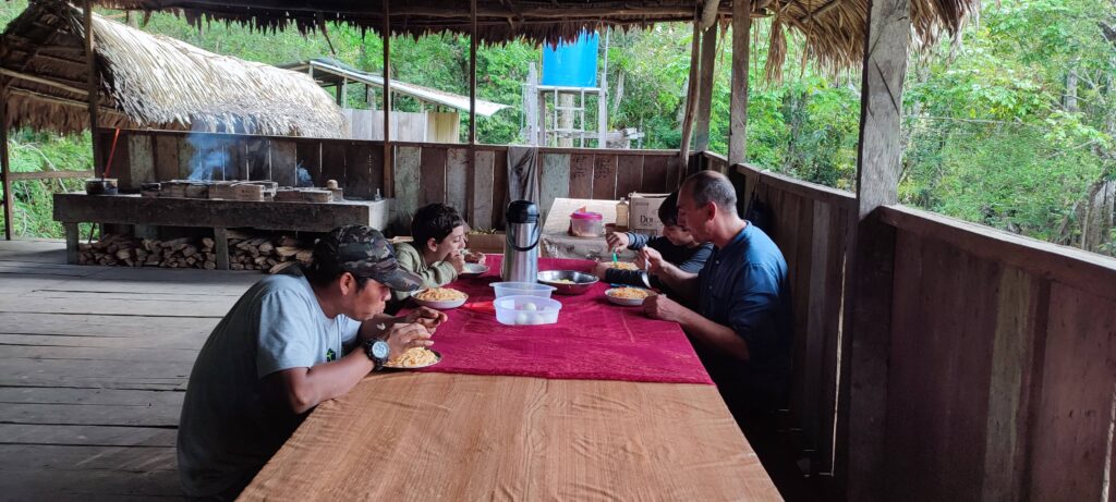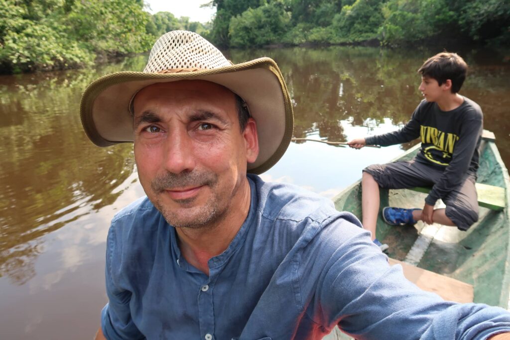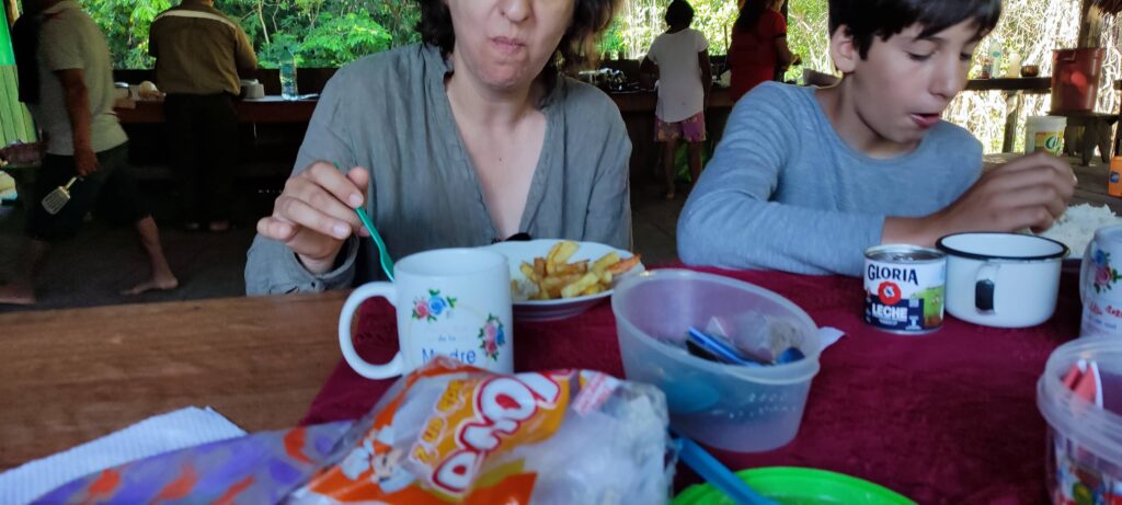 En contactant l’agence nous avions demandé des guides expérimentés car avec les enfants je ne voulais pas prendre de risques. Et bien nous n’avons pas été déçu. Nous sommes tombés sur des phénomènes, les garçons étaient plus en sécurité avec eux qu’avec nous! Pour les fans de Kho Lanta (et j’en connais quelques uns dans l’assistance), Claude vient de tomber de son pied d’estale avec tous ses petits copains aventuriers, ils peuvent tous aller se rhabiller. Aucun d’entre eux n’arrive à la cheville de Carlos. Si on devait le présenter : il doit être né dans la jungle pour avoir cette aisance, il connaît tous les arbres, tous les animaux, leur cri et leurs habitudes. Je l’ai vu un matin partir seul nus pieds dans la jungle. Il attrape les crocodiles à mains nues. Il joue de la machette comme personne que ce soit pour pécher ou couper des arbres. Quand il parle ce n’est pas pour rien dire. Il est toujours attentif à nous. C’est également un estomac sur pattes, faut dire qu’il est toujours actif. Il pêche, va chercher de l’eau, charge la barquette, pagaie à longueur de temps et accessoirement il joue aux cartes avec nous le soir. Il s’intéresse à tout sans être intrusif, il m’a demandé de lui apprendre bonjour, bon après-midi et bonne nuit en français. Son mot préféré est TRANQUILLE : aucune situation n’est stressante pour lui … il maîtrise parfaitement son sujet. Notre autre guide est Robita : un phénomène elle aussi. C’est certainement l’une des guides les plus âgée, tous les autres la respecte et ça se voit. Le soir Robita prend son bain dans El Rio et bien tous les autres attendent sagement qu’elle ait terminé. Madame prend son bain vers 20h30 moment où les crocodiles entament leur sortie pour chasser et lorsque je demande à Carlos : mais c’est pas dangereux Robita qui se baigne avec les crocros et les piranhas? Il me répond : t’inquiète tous les crocos connaissent Robita ils ne l’approchent pas! Robita est également un peu notre gouvernante (si on peut utiliser ce mot dans la jungle!), elle fait les lits, fait à manger et parfois anticipe même nos besoins. Aux petits soins Robita, et en plus elle pagaie comme une pro, sans compter également qu’elle sait imiter pas mal d’animaux. Nos guides sont très respectueux s’en était presque gênant au début et paraissaient même distants avec nous, ils mangeaient dans leur coin. Nous leur avons demandé s’ils voulaient bien partager les repas avec nous et avons essayé un maximum de participer à toutes les corvées avec eux. C’étaient de très beaux échanges!