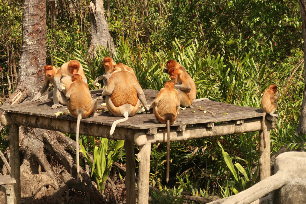 C’est à Sandakan que nous avons fait un peu de visites. D’abord nous sommes allés dans un sanctuaire de nasiques, un peu comme à Semenggoh avec les orang outan, des gardiens viennent distribuer des fruits aux nasiques sauvages du coin. Si ces derniers veulent grignoter libre à eux de venir ou pas! Cet endroit était bien moins touristique que Semenggoh. Peu de bruit ou alors des chuchotements, peu de gens donc parfait pour observer ces primates.