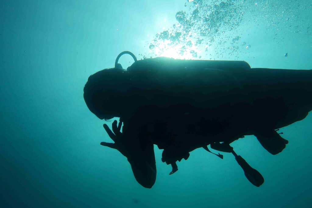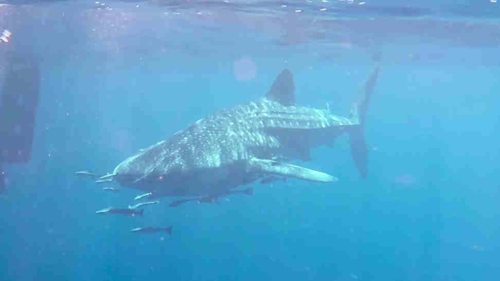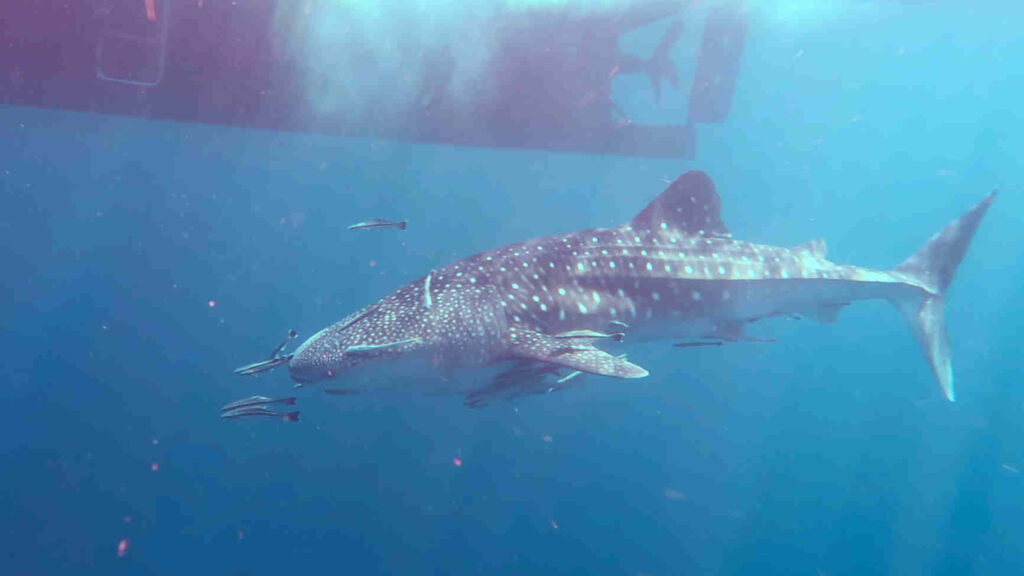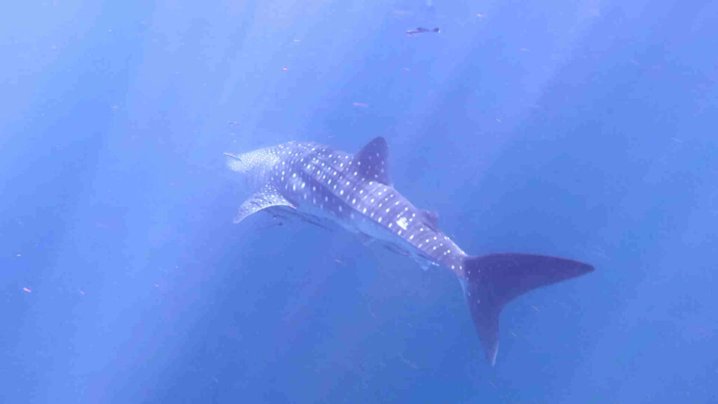 En fin de plongé, après notre dernier palier, nous venions tout juste de refaire surface : le voilà. Il est assez petit pour un requin baleine (entre 3,5 et 4 m – peut être 4,5m ……. « à peine »). Il est majestueux, se déplaçant doucement sans faire de mouvement… ou si peu. Et le voilà passant à quelques mètres de nous – bouche bée à nous décrocher la mâchoire. Ni une ni deux, on remet le détendeur en bouche – c’est facile puisqu’elle est déjà grande ouverte, et avec Stéphane criant un « on reste groupé… » un peu stressé de nous perdre dans l’euphorie générale, on redescend d’un mètre pour profiter du spectacle. Il ne durera pas, mais ce fût intense comme émotion.
