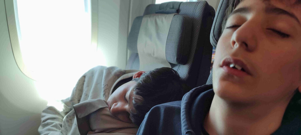 Lundi nous avons pris un premier avion pour Singapour. Arrivés sur place à 6h00 (heure locale – 24h00 pour nos horloges internes) nous étions bien fatigués. Nous avions 3h30 d’attente avant de prendre une correspondance pour Bankok. Autant dire, que nous étions très très fatigués, et que nous avons profiter de chaque petit moment pour faire une sieste.
