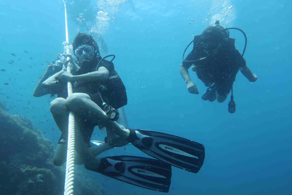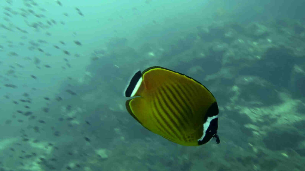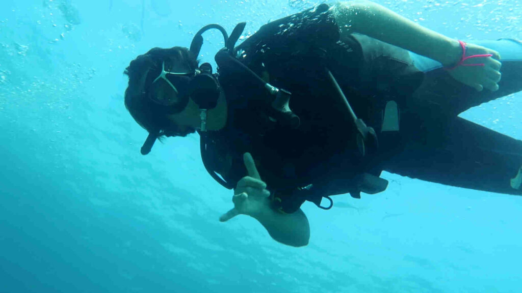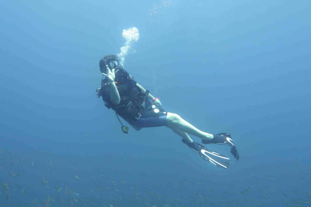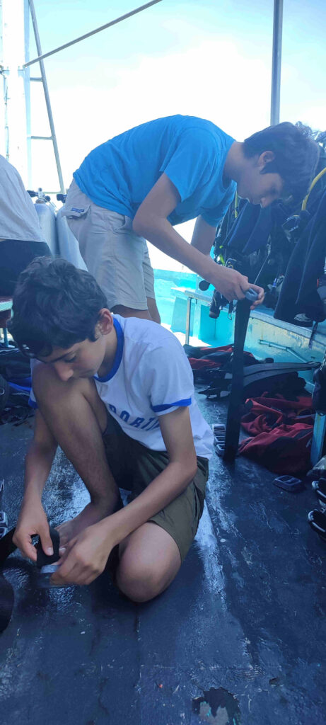 Nous nous dirigeons vers le sud ouest de l’île et naviguons pendant 3/4 d’heure pour rejoindre le site de plongé. Une fois arrivé sur place, un bateau déjà là nous signale la présence d’un requin baleine dans les parages. On l’aperçoit de loin… certains se précipitent déjà dans l’eau, nous ne sommes pas encore équipés… malheur !!