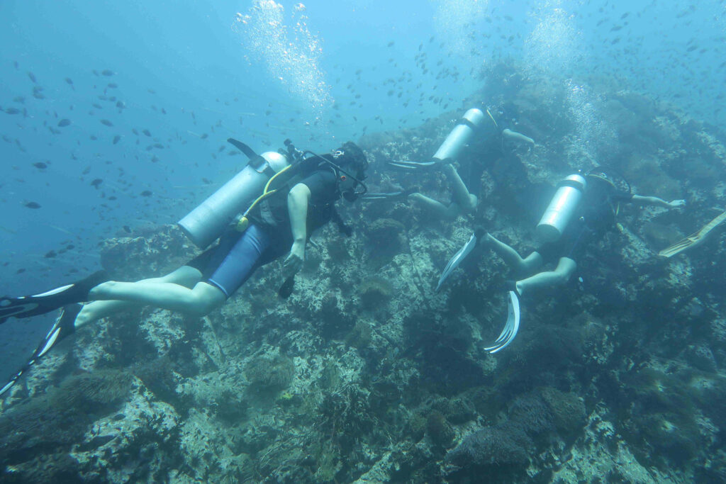 Les capitaines ont dû se passer le mot sur la présence du requin sur le site. Car, alors que nous n’étions que 2 bateaux au début, le temps de la pose, ce sont 3 bateaux supplémentaires qui sont venus. A la fin de notre 2ème plongée, nous évoluions dans un océan de bulles tellement nous étions nombreux.